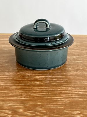 "Ulla Procopé designed the Meri series for Arabia in 1967. It consists of tableware parts with sturdy forms, blue-green glaze, and brown stripes".